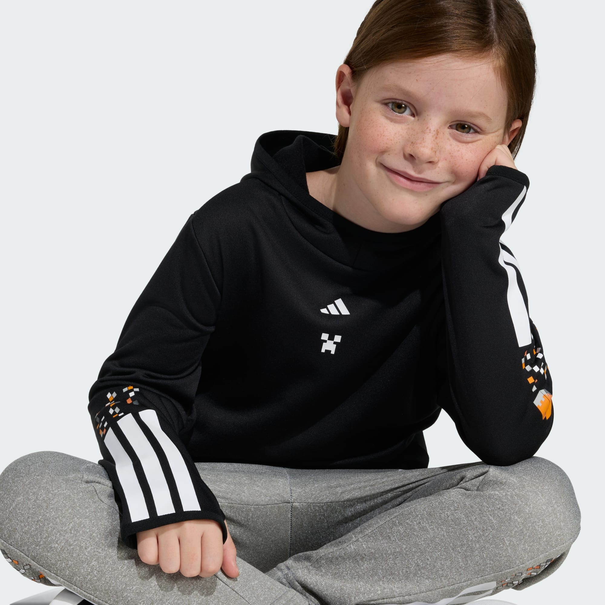 Der adidas Minecraft Training 3-Streifen Hoodie zelebriert das digital-physische Crossover-Erlebnis. Er vereint Komfort und Stil für dein Kind, ob es Minecraft-Welten baut oder auf dem Spielplatz herumtobt. Dieser Hoodie aus angerautem Fleece ist mit isolierenden Materialien ausgestattet, die an kühlen Tagen für Wärme sorgen. Die CLIMAWARM Technologie speichert Wärme und leitet Schweiß ab, für ein warmes, trockenes und konzentriertes Tragegefühl. Eine kuschelige Kapuze sorgt für angenehmes Tragegefühl und die Daumenöffnungen an den Ärmeln verhindern ein Verrutschen beim Spielen. Die kultigen 3-Streifen werden durch eine verpixelte Überblendung zu Minecraft-Figuren ergänzt und sorgen so für einen verspielten Touch. Komfort, Spaß und adidas Qualität kommen in diesem Kleidungsstück zusammen. Mit diesem Hoodie kann dein Kind Minecraft überall erleben, im Spiel und in der echten Welt.
