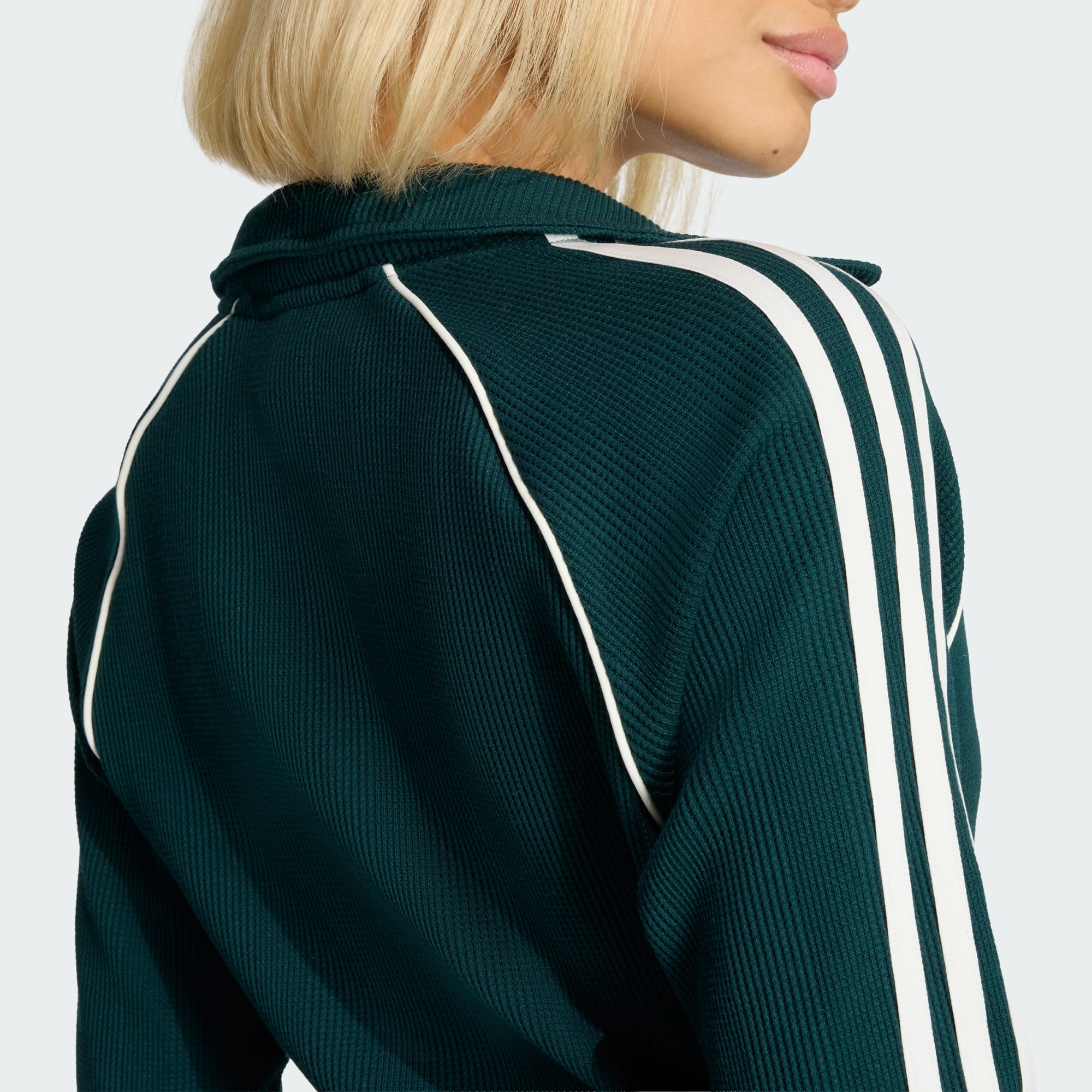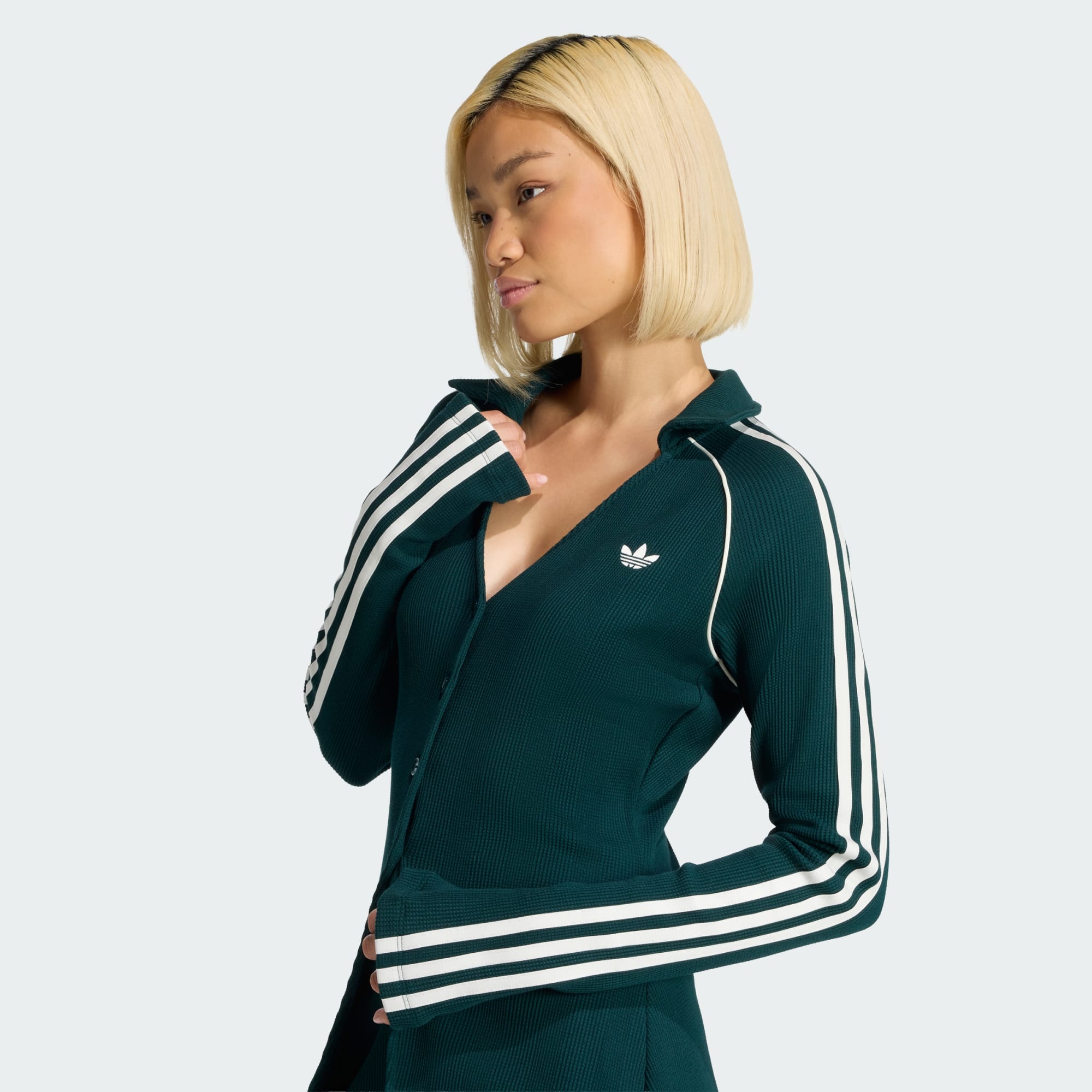 Das adidas Originals Waffle Top mit Knopfleiste ist eine großartige Wahl, wenn du einen Look kreieren willst, der mühelosen Stil und gemütlichen Komfort miteinander verbindet. Das Top ist mit hochwertigem Waffelstrick gefertigt und verziert mit einer Trefoil-Stickerei. Es liegt eng am Körper an und schafft eine schlanke Silhouette, die sich jeder Bewegung anpasst. Der Verschluss mit vier Knöpfen vorne in der Mitte sorgt für einen Hauch von Eleganz, während die Paspelierung an den Raglan-geschnittenen Glockenärmeln mit 3-Streifen-Band für sportliches Flair und einen Hingucker sorgt. Wenn du ein weiches Top suchst, das sich angenehm auf der Haut anfühlt, ist dieses Waffle Top aus Baumwolle genau das Richtige für lässige Ausflüge oder als zusätzliche Schicht unter einer Jacke. Die schmal geschnittene Passform sorgt für einen schmeichelhaften, figurbetonten und enganliegenden Look, der sowohl modern als auch zeitlos ist. Egal, ob du einen Tag mit Freunden verbringst oder dich zu Hause entspannst – das adidas Originals Waffle Top mit Knopfleiste ist ein vielseitiges, gemütliches und stylisches Kleidungsstück, das Lässigkeit ausstrahlt.