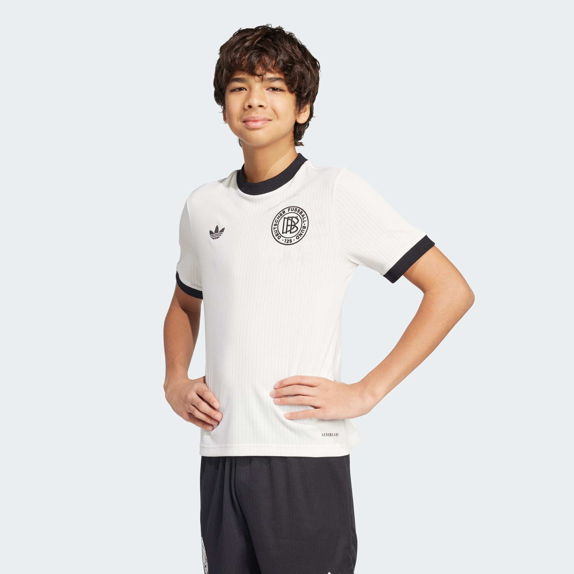 Feier mit uns das 125-jährige Jubiläum der deutschen Nationalelf und ihre lange Verbundenheit mit den 3-Streifen. Dieses Fußballtrikot für Kinder und Teens ist von legendären adidas Trikots aus früheren Zeiten inspiriert und kommt mit dezenten Nadelstreifen und einem Ton in Ton gehaltenen Adler, der in das weiche Jacquard-Material eingearbeitet ist. Außerdem garantiert die feuchtigkeitsabsorbierende AEROREADY Technologie trockenen und bequemen Tragekomfort. Der Schriftzug über dem Saum zitiert die Gedenktafel, die an die Gründung des DFB in Leipzig erinnert. Dieses Produkt wurde aus 100 % recycelten Materialien hergestellt. Die Wiederverwendung vorhandener Materialien reduziert Abfall, unsere Abhängigkeit von nicht erneuerbaren Ressourcen und den Fußabdruck unserer Produkte.