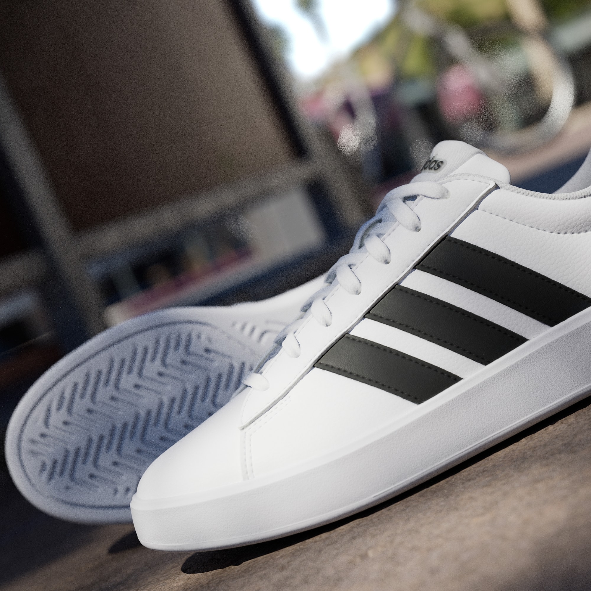 Cloudfoam bietet ganzheitlichen Komfort vom ersten bis zum letzten Schritt mit zusätzlicher Dämpfung. Das Obermaterial aus Synthetikleder sorgt für Strapazierfähigkeit und ein erstklassiges Tragegefühl, während der adidas Markenname auf dem Detail im Fersenbereich und der Zunge einen authentischen Akzent setzt.