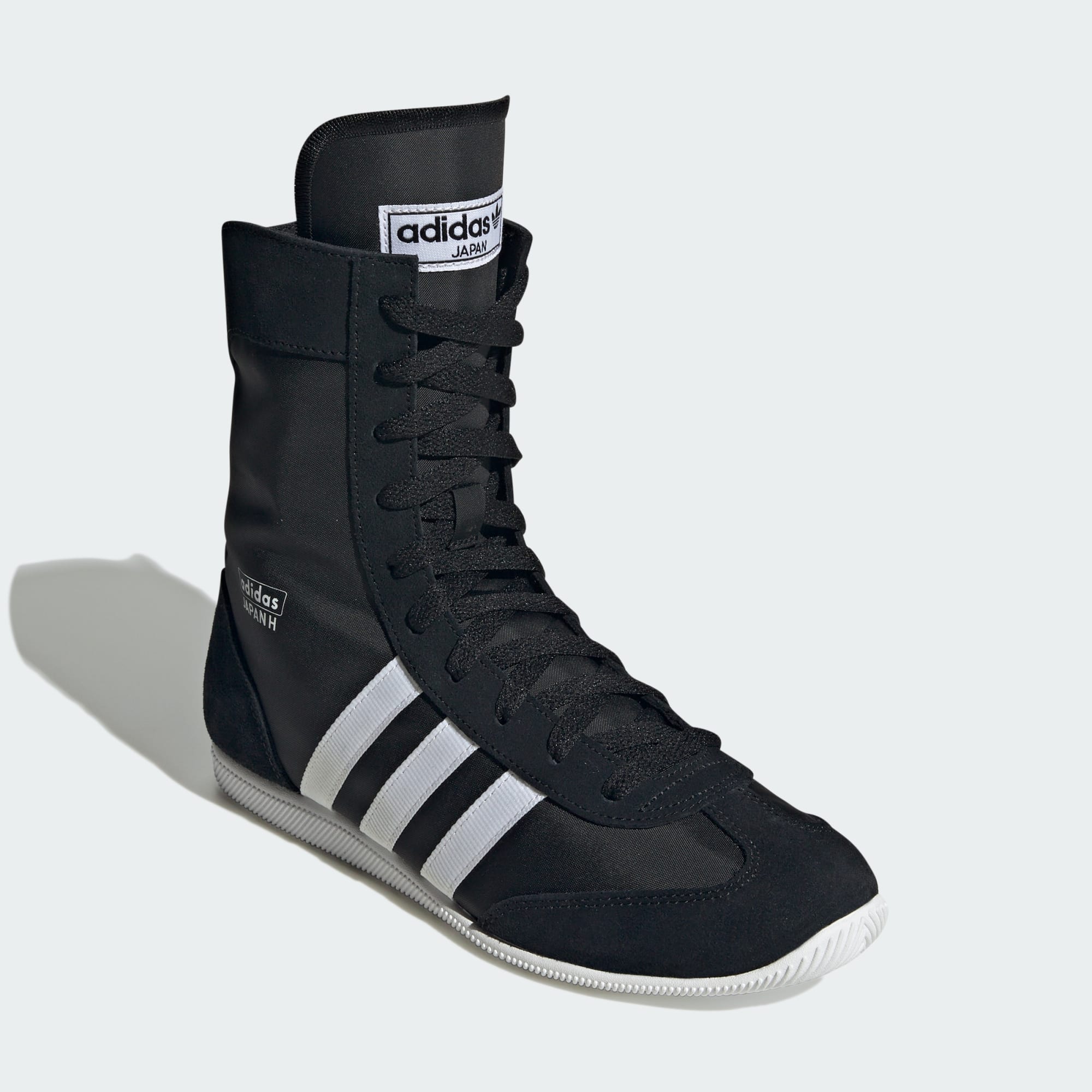 Der Japan High Schuh ist von einem Nischen-Boxschuh aus den 80ern inspiriert und verpasst der authentischen Sportsilhouette ein stylishes Streetwear-Update. Er ist aus weichem Nylon und kommt mit einem T-förmigen Overlay im Zehenbereich, einer Fersenkappe und Overlays aus Wildleder. Die hohe Zunge reicht bis oben. Die strukturierte, keilförmige EVA-Sohle gibt dir optimalen Halt und ist gleichzeitig bodennah. Die auffälligen 3-Streifen und der adidas Japan H Schriftzug in Gold-Optik an den Seiten runden das Design ab. Kombiniert mit Shorts oder einem Rock wird ein stylisher Look draus.