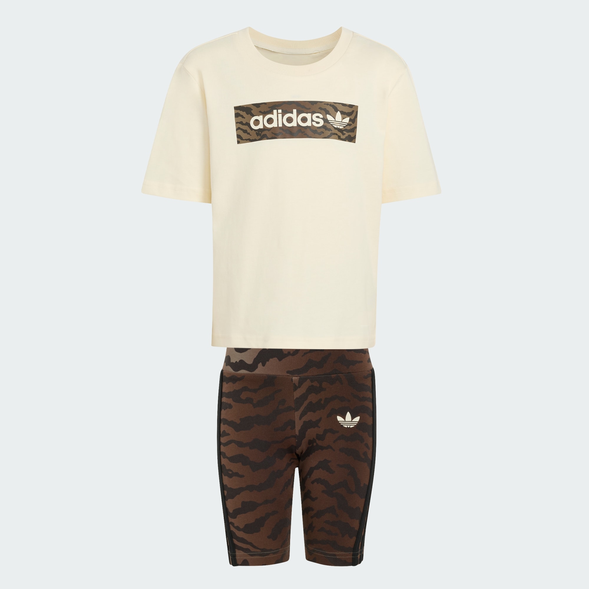 Das kurze AOP Cycling T-Shirt-Set bringt mit seinem mutigen, ausdrucksstarken Design verspielte Energie in die Kindergarderobe. Mit diesem T-Shirt und den Shorts können die Kids ihren eigenen Stil bequem zum Ausdruck bringen. Das locker sitzende Oberteil sorgt für einfache und uneingeschränkte Bewegung, während die eng anliegenden Shorts sie beim aktiven Spiel sicher unterstützen. Beide Stücke sind so konzipiert, dass sie mit Selbstbewusstsein und Leichtigkeit getragen werden können. Das aufgestickte Trefoil bringt einen Hauch des adidas Originals Erbes mit sich und verbindet Stil mit unserem Erbe. Das Tiger-Muster verleiht dem Set einen lebendigen, auffälligen Look, der für Individualität und Spaß steht.