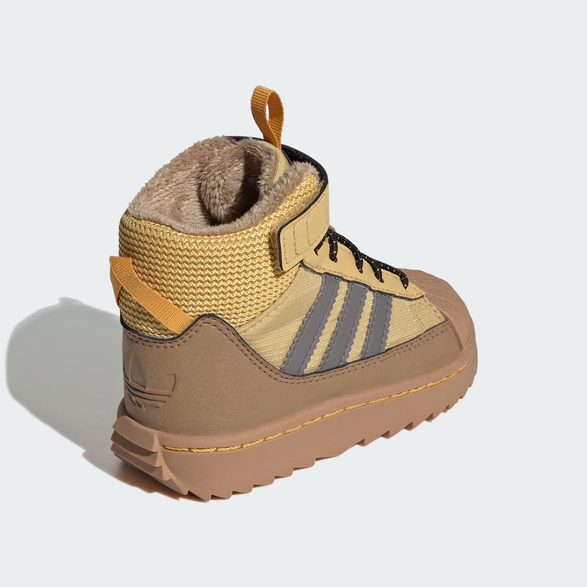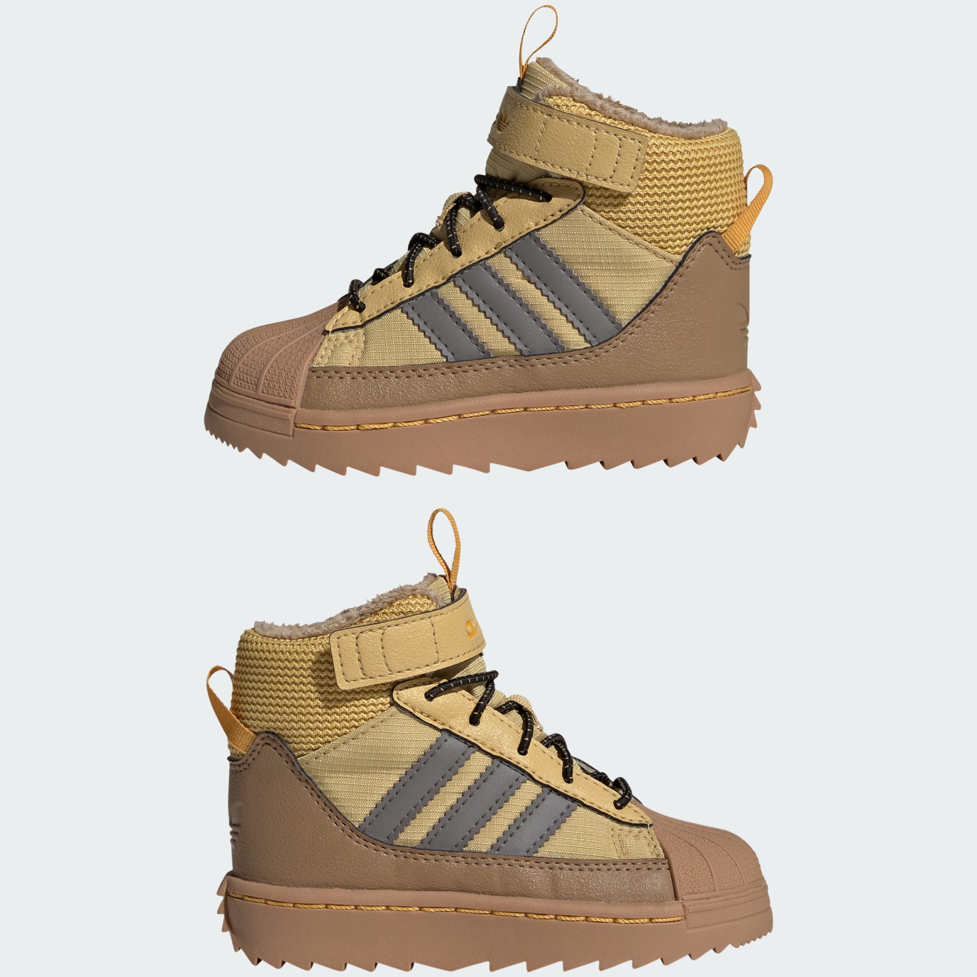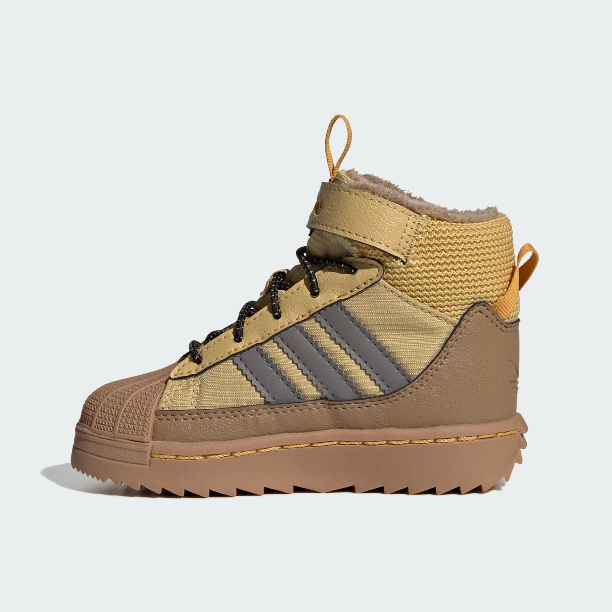 Dieser adidas Superstar Winter Trek Schuh für Babys und Kleinkinder bietet kleinen Abenteurer_innen im Winter ikonischen Style und optimalen Schutz. Der Innenschuh hält Regen und Schnee ab, während die robuste Außensohle guten Grip auf rutschigem Untergrund garantiert. Elastische Schnürsenkel und ein Riemen am Schaft erleichtern das An- und Ausziehen mit kalten Fingern. Die Wildleder-Overlays auf dem Nylon-Obermaterial greifen den sportlichen Look des Originals auf und machen ihn wintertauglich.