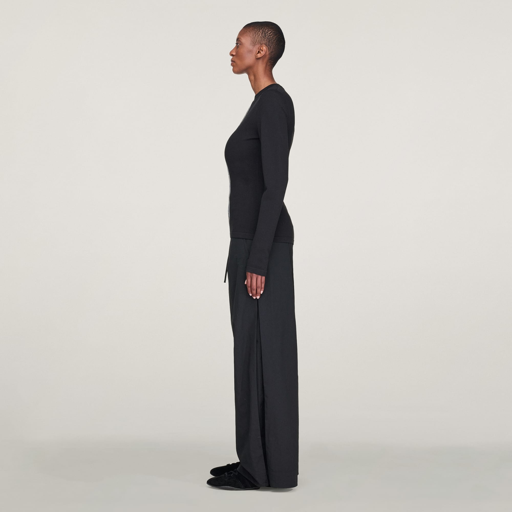 I love this nylon sweater which is not itchy! The best part are the strings that you pull in the center to ruche and it can change the look in so many ways. I am petite and 'chesty' so went with a large for a relaxed fit. Wish it was slightly shorter but the ruching helps. Medium would have been perfect but it was sold out. Please make this in same material but in a deep red color and more black!!