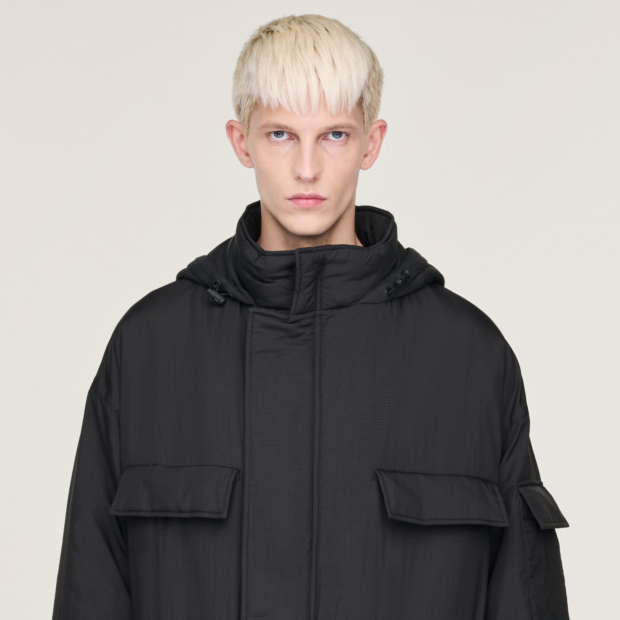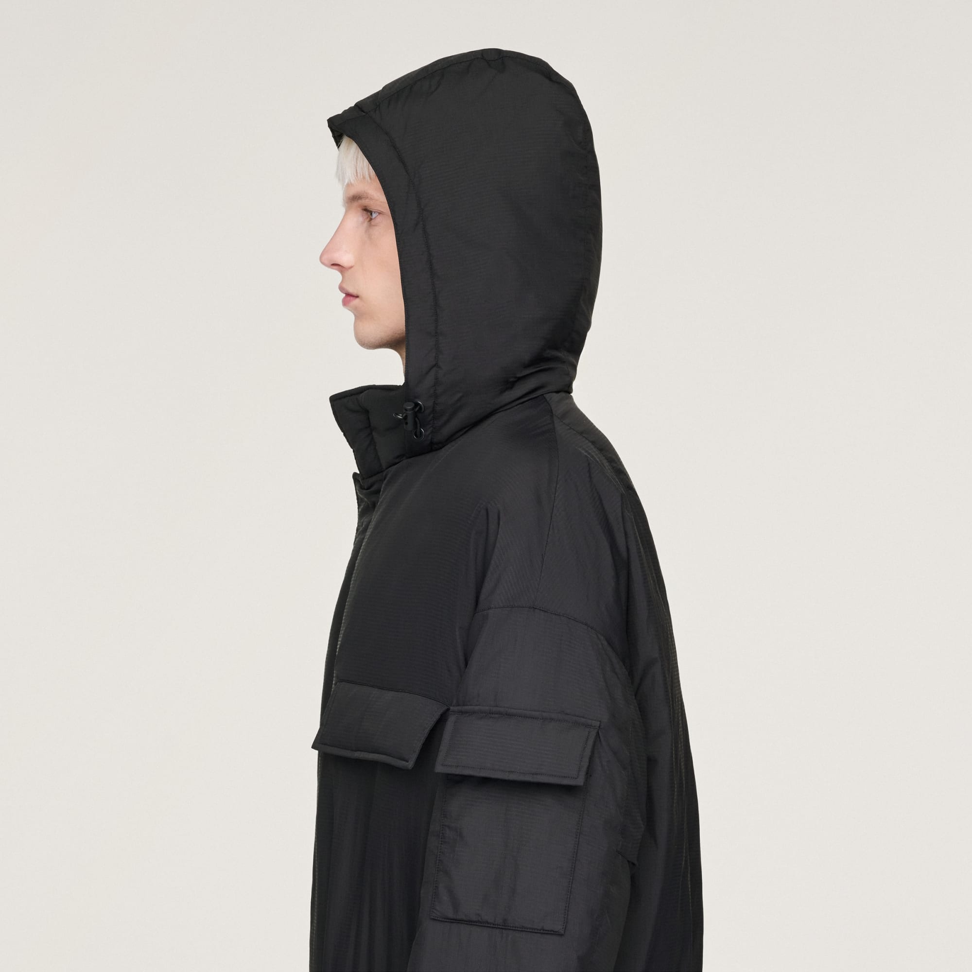 - Durchgehender Reißverschluss mit Klappenverschluss und verstellbarer Kapuze